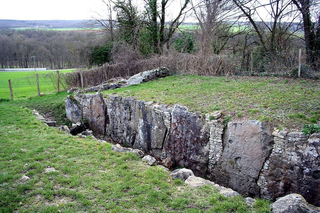 ■ Matériaux : Le monument est constitué d’imposantes dalles de grès formant des piliers entre lesquels sont empilées de petites dalles calcaires pour combler les interstices.